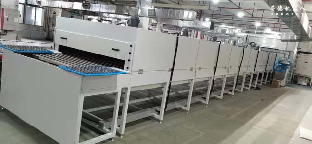 上件→預熱→自動噴A面→烘干→冷卻→半自動翻面→預熱→自動噴B面→烘干→冷卻→下件