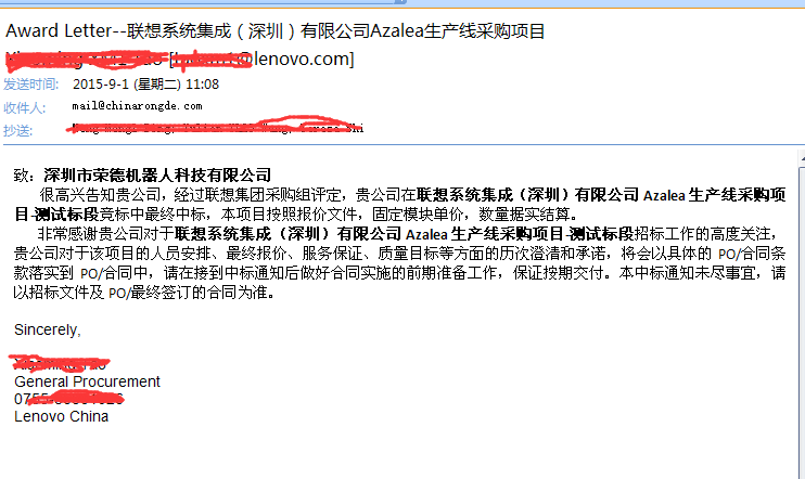 很高興告知貴公司,經(jīng)過聯(lián)想集團(tuán)采購組評定,貴公司在聯(lián)想系統(tǒng)集成(深圳)有限公司Azalea生產(chǎn)線采購項目-測試標(biāo)段競標(biāo)中最終中標(biāo),本項目按照報價文件,固定模塊單價,數(shù)量據(jù)實結(jié)算。