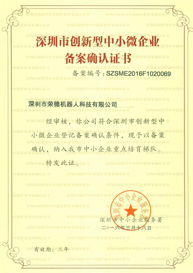 深圳市榮德機(jī)器人科技有限公司在2015年11月份提交了申請(qǐng)材料,經(jīng)過(guò)三個(gè)月的嚴(yán)格審核,終于在2016年3月18日獲得了創(chuàng)新型中小微企業(yè)證書。