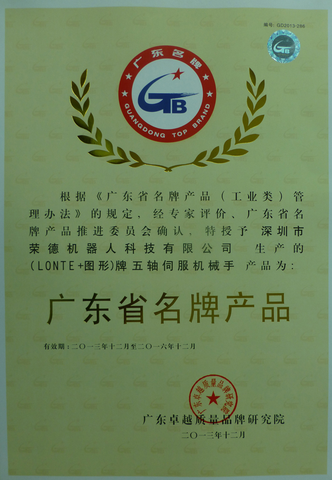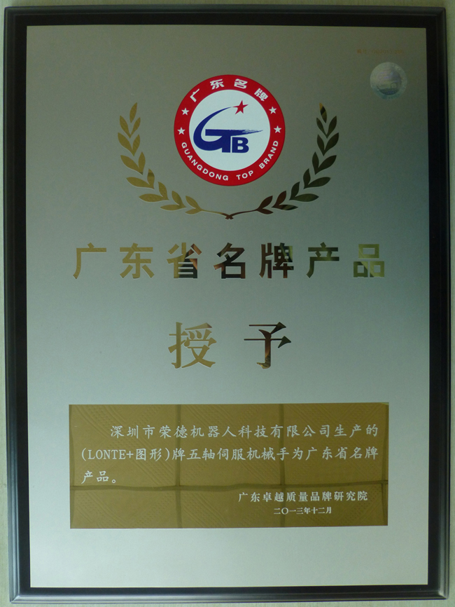 廣東省名牌產(chǎn)品申報(bào)可以說是相當(dāng)嚴(yán)格,體現(xiàn)了該榮譽(yù)的嚴(yán)肅性、公正性。這也充分證明了深圳市榮德機(jī)器人科技有限公司的綜合實(shí)力以及客戶對榮德公司的滿意程度。