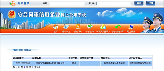 近日,廣東省工商行政管理局向社會公示了全省“守合同重信用”企業(yè)名單,深圳市榮德機(jī)器人科技有限公司喜獲上榜,首次榮獲該榮譽(yù)稱號。
