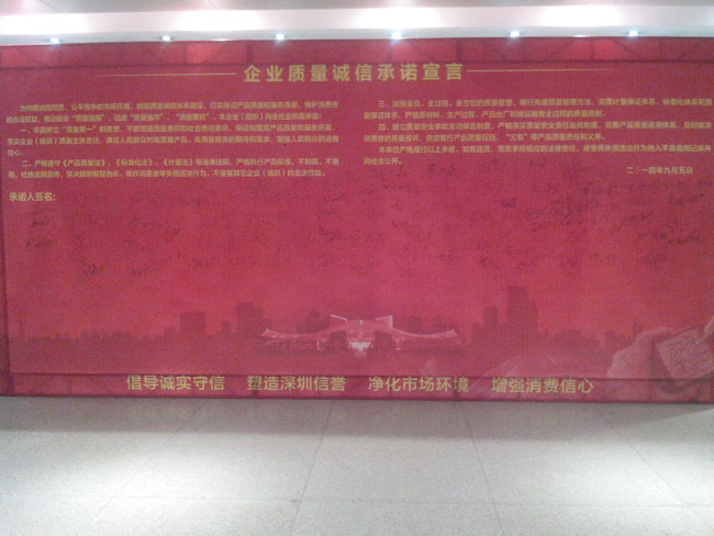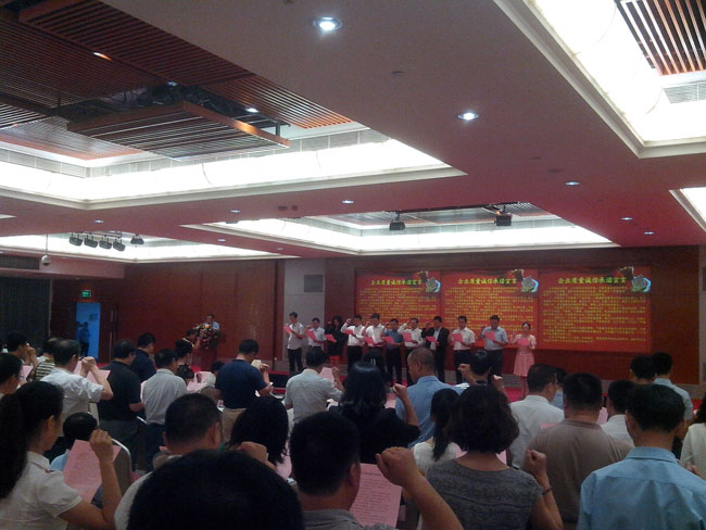 大會(huì)的高潮部分是所有與會(huì)的企業(yè)代表與政界代表一起舉起右手,宣讀《企業(yè)質(zhì)量誠信承諾書》:為構(gòu)建誠信經(jīng)營、公平競爭的市場環(huán)境,加強(qiáng)質(zhì)量誠信體系建設(shè),切實(shí)保證產(chǎn)品質(zhì)量,維護(hù)消費(fèi)者的合法權(quán)益,推動(dòng)建設(shè)“質(zhì)量強(qiáng)國”,促進(jìn)“質(zhì)量強(qiáng)市”、“質(zhì)量惠民”。本企業(yè)向社會(huì)鄭重承諾:一、牢固樹立“質(zhì)量第一”的思想,不斷增強(qiáng)質(zhì)量意識(shí)和社會(huì)責(zé)任意識(shí),保證和提高產(chǎn)品質(zhì)量,落實(shí)企業(yè)質(zhì)量主體責(zé)任,滿足人們?nèi)罕妼Ω哔|(zhì)量產(chǎn)品的期待和需求,增強(qiáng)人民群眾的消費(fèi)信心。二、嚴(yán)格遵守《產(chǎn)品質(zhì)量法》、《標(biāo)準(zhǔn)化法》、《計(jì)量法》等法律法規(guī),嚴(yán)格執(zhí)行產(chǎn)品標(biāo)準(zhǔn),不制假、不售假,杜絕虛假宣傳,堅(jiān)決抵制假冒偽劣、欺詐消費(fèi)者等失信違法行為,不侵害其他企業(yè)合法權(quán)益。三、加強(qiáng)全員、全過程、全方位的質(zhì)量管理,推行先進(jìn)質(zhì)量管理方法,完善計(jì)量保證體系、標(biāo)準(zhǔn)化體系和質(zhì)量保證體系,嚴(yán)格原材料,生產(chǎn)過程、產(chǎn)品出廠和儲(chǔ)運(yùn)銷售全過程的照顧質(zhì)量控制。四、建立質(zhì)量安全事故主動(dòng)報(bào)告制度,嚴(yán)格落實(shí)質(zhì)量安全責(zé)任追究制度,完善產(chǎn)品質(zhì)量追溯體系,及時(shí)解決消費(fèi)者的質(zhì)量投訴,自覺履行產(chǎn)品質(zhì)量召回、“三包”等產(chǎn)品質(zhì)量責(zé)任和義務(wù)。本單位嚴(yán)格履行以上承諾。如有違反,愿意承擔(dān)相應(yīng)的法律責(zé)任,接受將失信違法行為納入不良信用記錄并向社會(huì)公開。二0一四年九月五日