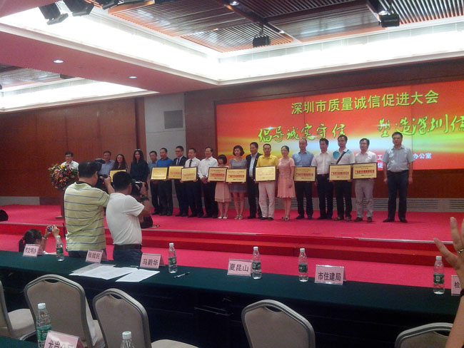 大會(huì)最后一項(xiàng)議程是頒發(fā)2013年“廣東省守合同重信用”證書及牌匾,我公司代表也受邀請上臺(tái)領(lǐng)取證書及牌匾。