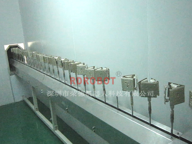 在設(shè)計噴涂車間時,整個涂裝作業(yè)區(qū)進行全封閉設(shè)計,整體設(shè)備與外界隔斷,噴涂區(qū)供氣經(jīng)凈化處理,保證空氣潔凈度10萬級以內(nèi)。人工方式把工件組裝在二次治具上,然后與輸送鏈上的一次治具插接,治具特點:其自轉(zhuǎn)靈活,插接方便,屬本行業(yè)的領(lǐng)行技術(shù)。