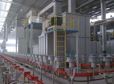 涂裝生產(chǎn)線主要工藝流程是上件→拋丸除銹→清理吹灰→噴鋁→底漆噴漆流平→底漆烘干→中涂噴漆流平→中涂烘干→面漆噴漆流平→面漆噴漆烘干→下件。涂裝線的防腐環(huán)境是室外(不直接淋雨),高架橋腹部波紋板。保護(hù)年限為長(zhǎng)效型,50年。主要針對(duì)工廠構(gòu)件外表面涂漆,不考慮施工后涂裝。前處理拋丸,Sa3.0級(jí)、粗糙度/75-120um、清潔度/1級(jí)。基材涂層為電弧熱噴鋁,120-150μm;底涂層為環(huán)氧富鋅底漆,60-80μm,90℃60分鐘烘干。中間涂層為環(huán)氧云鐵中間漆,150-180μm;90℃90分鐘烘干。 面漆為丙烯酸聚氨酯或氟碳漆面漆,40-60μm。90℃60分鐘烘干??偲崮ず穸龋骸?50μm。