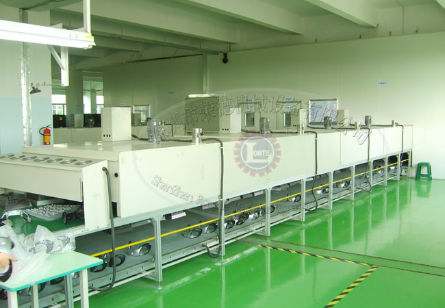 噴漆烘干流水線技術(shù)優(yōu)勢:該裝置反射鏡采用聚光型冷鏡,燈下加裝石英玻璃板,可有效降低被照物表面溫度;變頻無級調(diào)速,保證傳送平穩(wěn);觸摸屏微電腦自動控制,實現(xiàn)人機對話;每套UV系統(tǒng)獨立控制,依生產(chǎn)開啟燈管數(shù)量;每支燈設(shè)累計工作計時器,方便掌握燈管工作時間和老化程度;透明視窗,工作時可以觀察固化燈工作情況,并設(shè)開門保護裝置;燈管及燈罩可以上下調(diào)整。